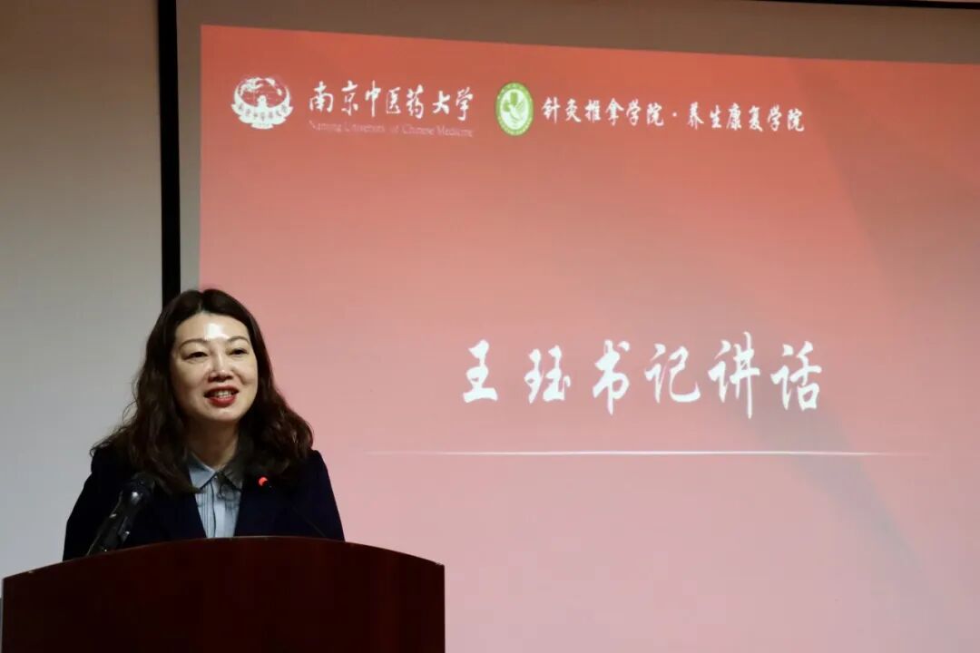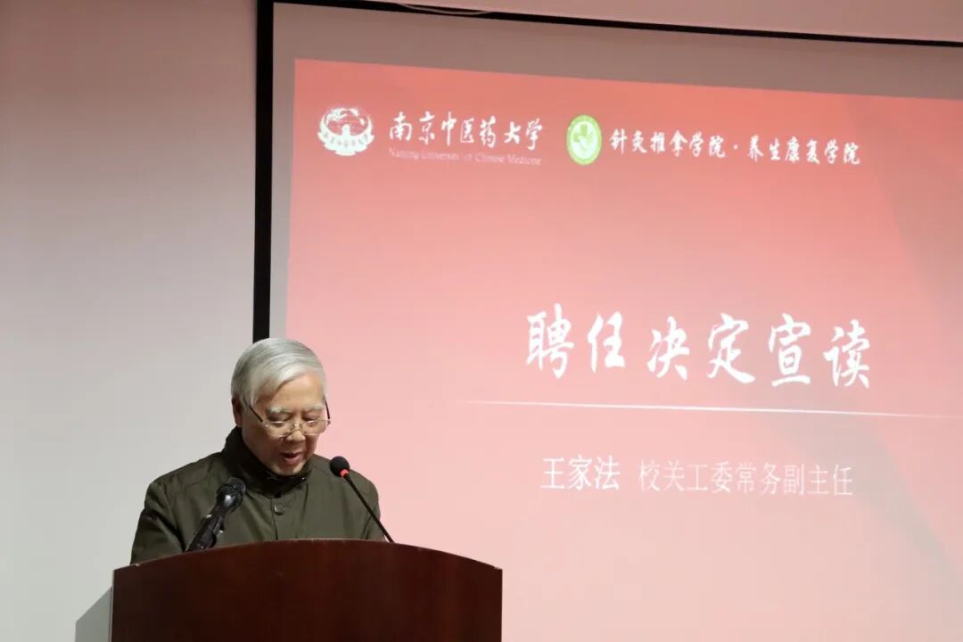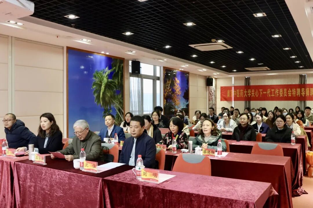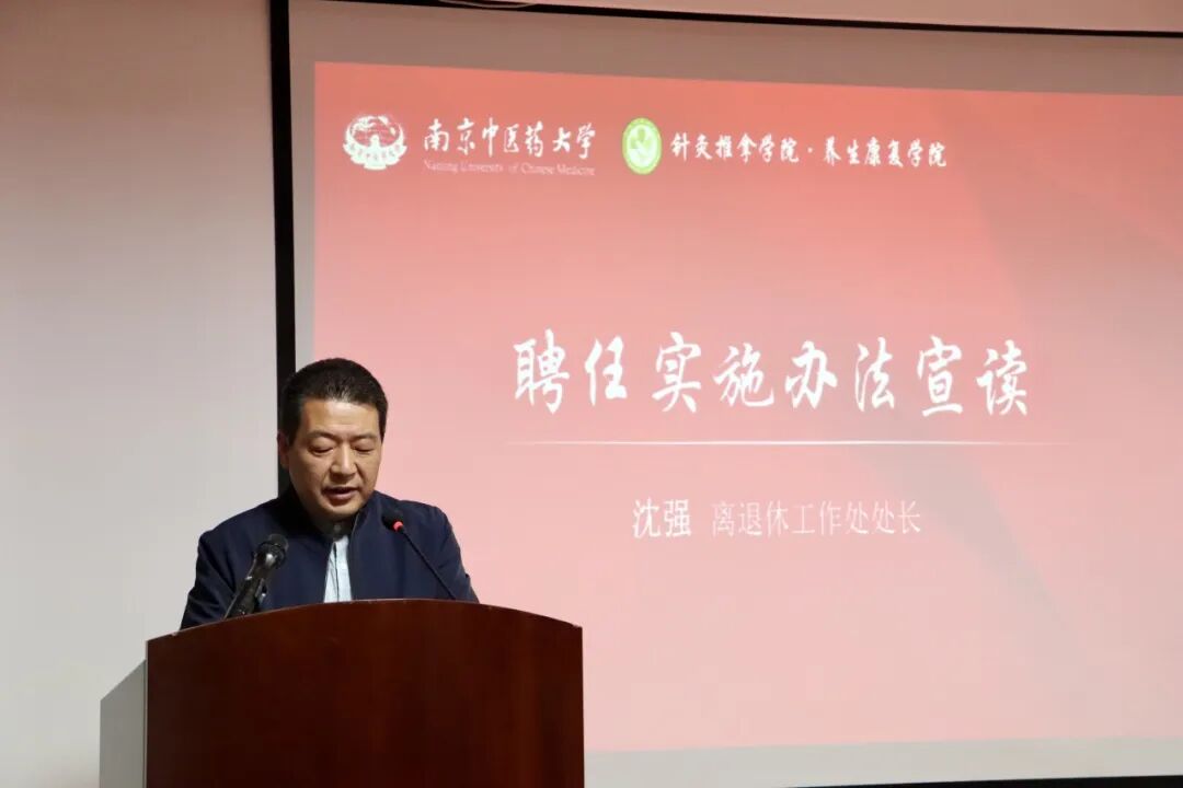 校关工委秘书长、离退休工作处处长沈强宣读《南京中医药大学关心下一代工作委员会特聘导师聘任实施办法》,鼓励老教授、老党员、老同志积极走进学生的第二课堂,充分发挥自身经验优势、威望优势和智慧优势,紧紧抓住立德树人这一根本任务,积极发挥余热,引领学生为实现健康中国贡献自己的青春才华。