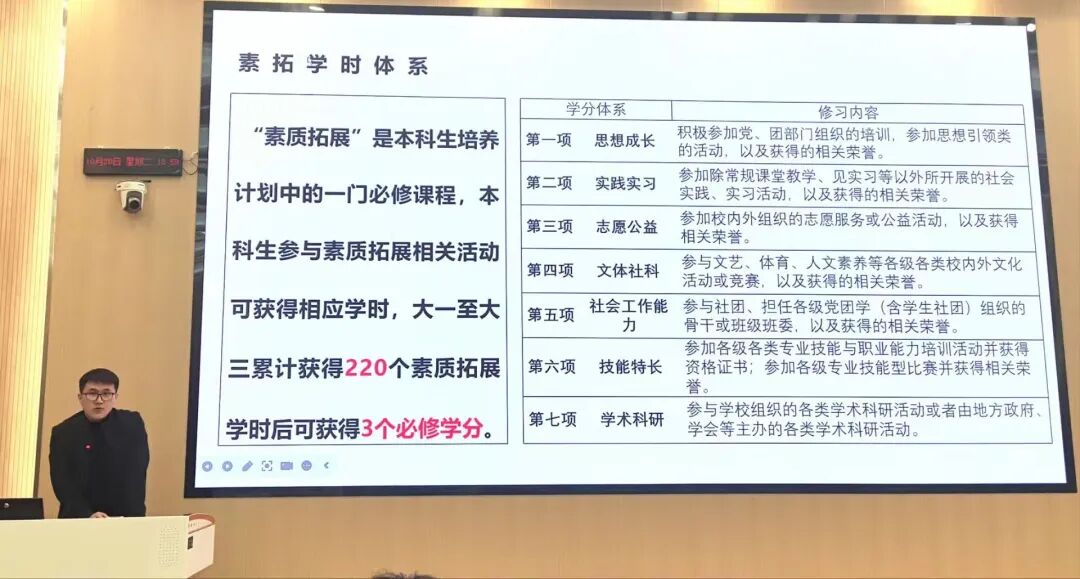 最后,陈老师强调综合素质拓展的重要性,引导同学们关注素质拓展学时体系:“大学的舞台远不止于课堂,思想政治、志愿公益、学术科研、技能特长等七大模块,共同构成未来发展的核心竞争力,希望大家主动规划,在实践中全面提升自身素质。”整场讲话既有宏观学业导航,又有微观方法指导,为新生们送上了详实而温暖的“大学生涯行动地图”。