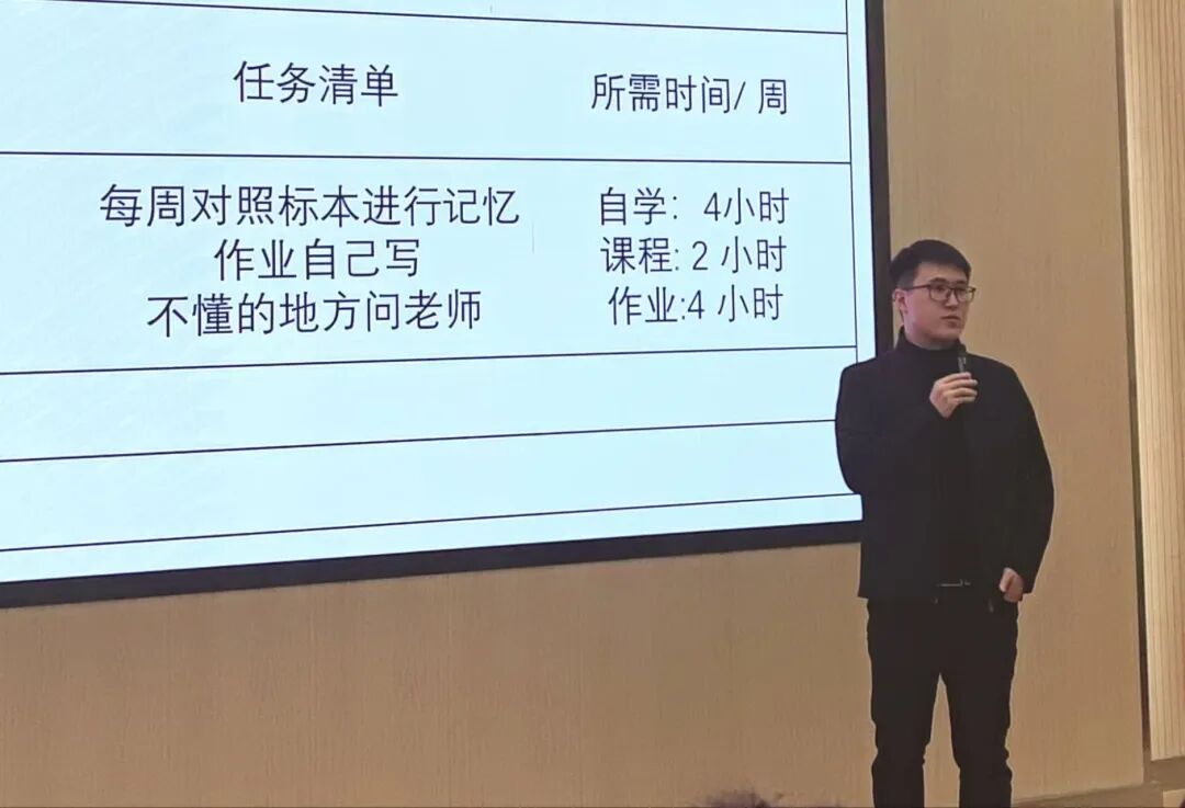 在学业方法指导环节,陈老师结合屏幕上清晰罗列的时间分配表,给出具体建议:“‘每周对照标本记忆’‘作业独立完成’‘及时请教老师’,这三点看似简单,却是构建扎实专业基础的铁律;而每周10小时的稳定投入,正是将知识内化为能力的必经之路。”谈及考试备战,他分享高效复习法:“‘十分钟后自测’‘次日再回顾’,遵循的是记忆的科学规律,同时要学会从‘解释’‘定义’‘列举’等题型中反推复习重点。”针对同学们普遍关心的论文写作与拖延问题,陈老师以“逆向日程表”为例,生动演示如何将学期论文分解为可控步骤:“从11月20日确定题目,到12月20日上交,每一步都清晰明确。这是战胜‘拖延症’最有效的武器——用稳定的‘常规’工作流程,替代对‘完美’结果的焦虑。”