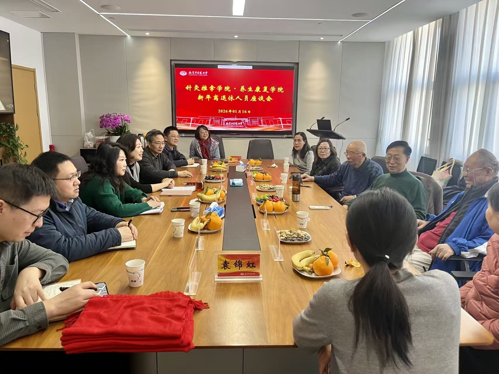 退休教师新春座谈会在丰盛楼608会议室举行,院领导班子、针灸系主任倪光夏、工会主席王建珠及相关教研室负责人与退休教师欢聚一堂,共迎新年,座谈会由院党委书记王珏主持。