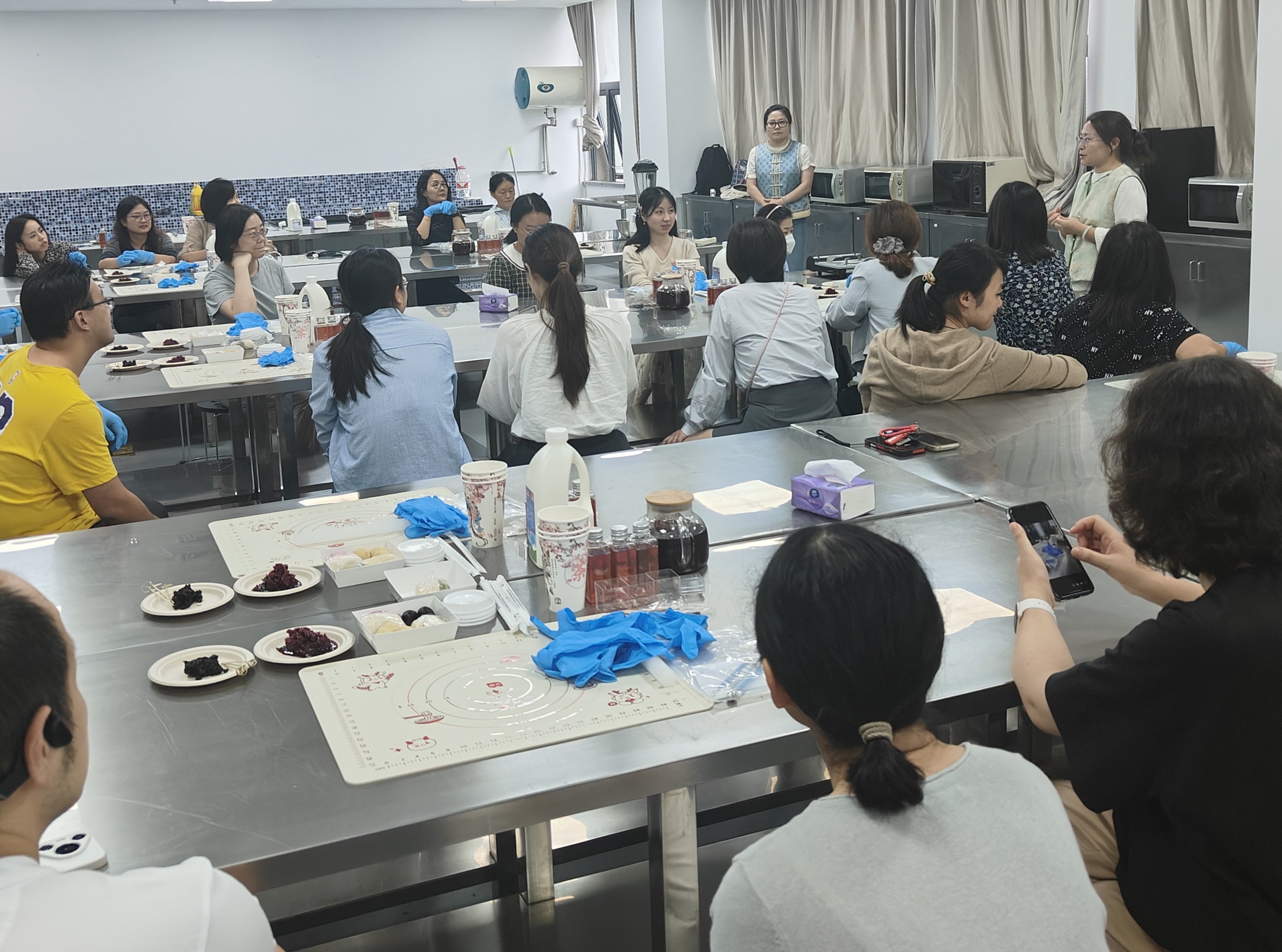 活动以“药食同源”理念为核心,精心组织了三个兼具文化底蕴与养生功效的药膳制作项目,分别是制作寓意团圆美满的宋韵桃花酥、失眠人群“刚需”甜品百合桑椹慕斯以及《本草纲目拾遗》同款红楼玫瑰露奶茶,让教师们沉浸式体验“中医治未病”与食疗的魅力。活动现场,吴华结合食材特性为大家深入讲解了养生知识,从《黄帝内经》“五谷为养”的理论到当代药膳标准化建设,让老师们深入了解每味食材背后的中医哲理,深刻感受到传统中医智慧与现代生活实践的深度融合。