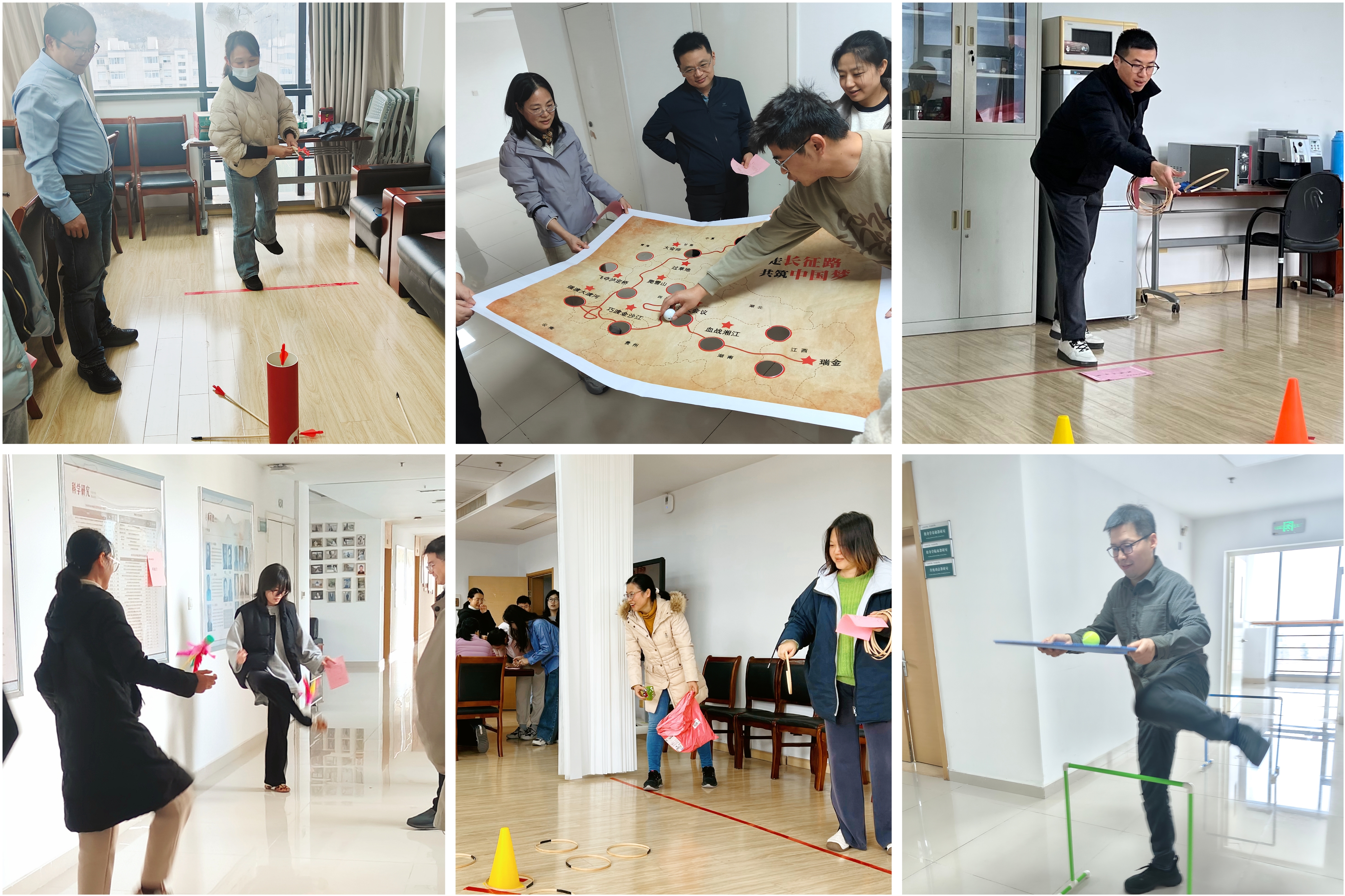 团体赛将活动推向了高潮。“重走长征路”项目模拟艰难险阻长征路,各队成员齐心协力,在实践中深刻体会团结与坚持的力量;“萝卜蹲”游戏则凭借其简单的规则和快速的节奏,迅速点燃全场热情,口号声、欢笑声、加油声此起彼伏,展现了教职工们活泼可爱、充满活力的一面。
